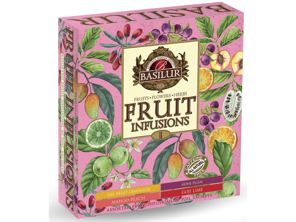 Štýlová darčeková kazeta plná ovocných čajov prináša osviežujúce chute a vône pre každý okamih. Osviežujúca kustovnica s limetkou, tropické mango s broskyňou, sladká malinovka s ovocím a aromatická slivka s noni – ochutnajte tieto jedinečné príchute.