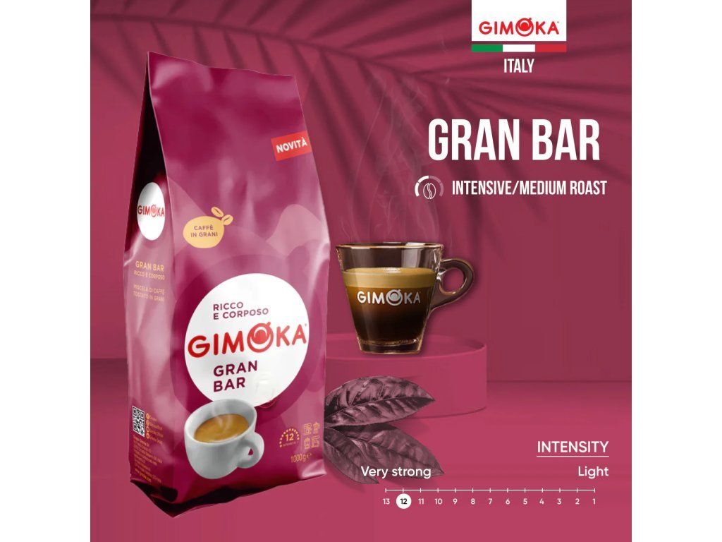 Popis: Gimoka Gran Bar je najintenzívnejšia zmes v ponuke značky Gimoka, ktorá vás osloví svojou silou, plným telom a hustou cremou. Vysoký podiel robusty dodáva káve poriadnu dávku kofeínu, takže je ako stvorená na ráno či hektické dopoludnie. Jej chuť je výrazná, horkejšia, s čokoládovým dozvukom – skvelá voľba pre milovníkov silného espressa, cappuccina aj latté.