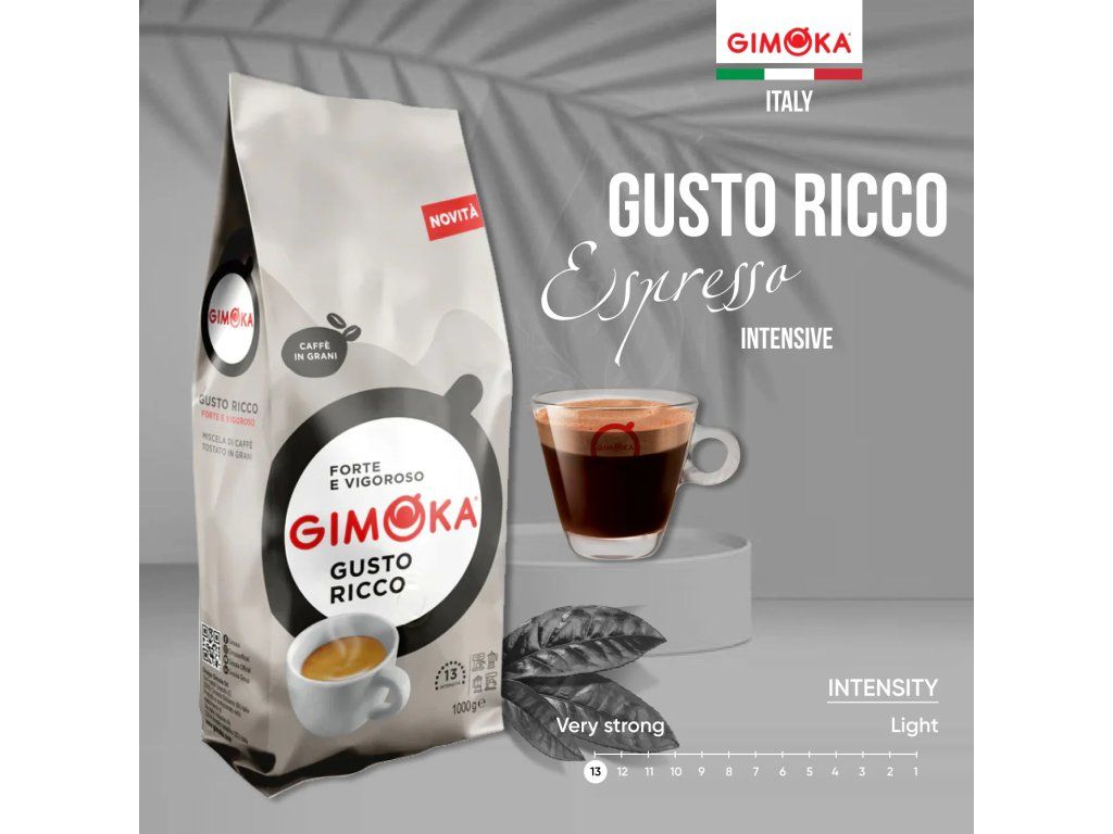 Popis: Gimoka Gusto Ricco je zmes kávy s intenzívnou chuťou a bohatou arómou, ktorá vyniká plným telom a jemnou, pretrvávajúcou dochuťou. Táto káva je ideálna pre prípravu espressa aj moka, kde sa prejaví jej výrazný charakter a príjemná aromatičnosť.